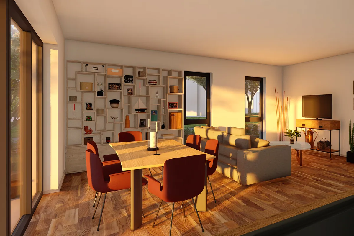 - einen großzügigen Wohn-/Ess-/Kochbereich, der viel Tageslicht ermöglicht und Mittelpunkt des Wohnens ist