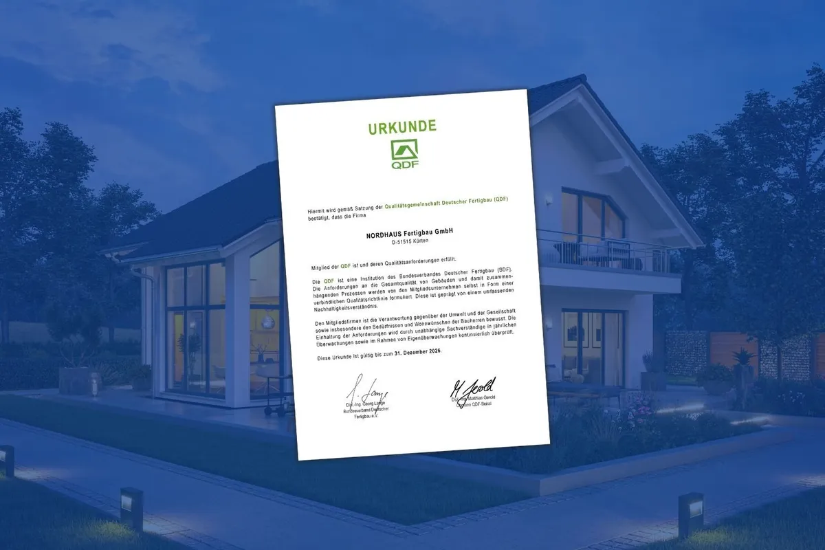 Wir freuen uns, dass wir auch für das Jahr 2026 erneut die QDF-Zertifizierung erhalten haben. Diese Auszeichnung bestätigt: NORDHAUS erfüllt die hohen Standards des Bundesverbandes Deutscher Fertigbau (BDF) und das seit vielen Jahren zuverlässig.